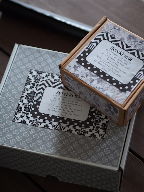 Havut muistuttivat minua allergiasta ja sain itseni yllättävän nopeasti tukkoon. Olin unohtanut tämän riesan viime vuodelta, kun meillä oli oikea kuusi sisällä. Katsotaan miten käy tänä jouluna. Joutaako nakkaamaan kuusen ulos ja lähteä muovikaupoille? ;)